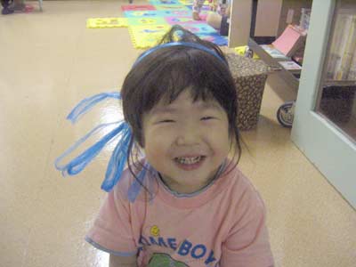 えへへ〜! 髪を留めるゴムがなくなっちゃったので・・・。 |