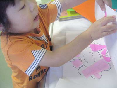 花の絵を描いてあげると花びらをピンクで張り始めたが、