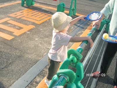 今日は我々ジジババもお外で遊ばせようと、遊び道具としてテニポンを持って行きました。