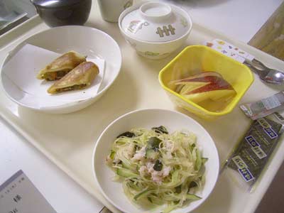 春巻き、春雨、うさリンゴ。 初めてです。 板ノリは大好きで、1枚1枚分けずにそのままバリバリ囓って食べました。 |