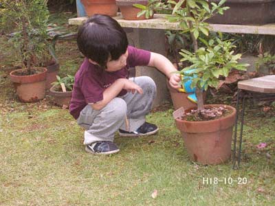 水やり。 まだ利き手が決まってないですね。 |