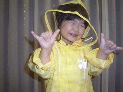傘は視界が悪いので、レインコートをおママが調達。 似合う? |