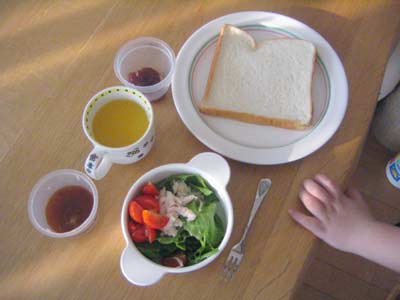 いたっきまーす! サラダに手こずったが、子自らにレタスをちぎらせたのがよかったのか、完食してくれた。 |