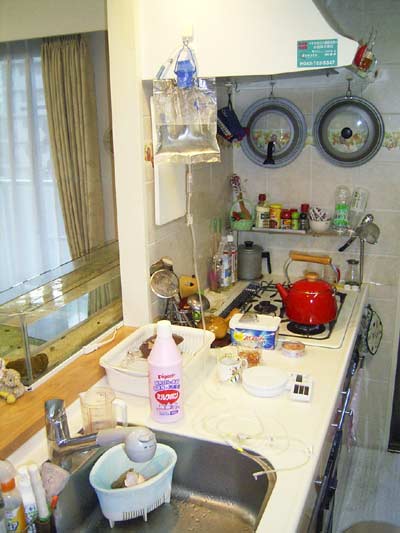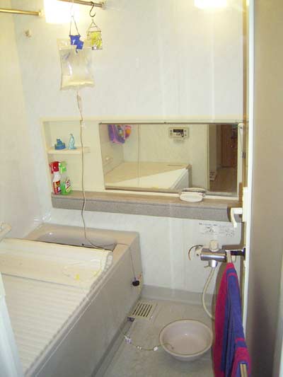 今日もいろいろ試します。 胃ロウからの栄養剤注入のパック。 ルートの管の中は洗いにくいんです。 マグネットのフックで自然滴下。 水→漂白剤→水で良いでしょう。 しかし場所が、邪魔。 |