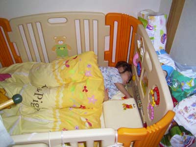 しかし子の寝相は最悪で、檻にガンガンぶち当たる。
