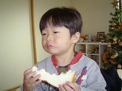 朝食。 ジャムを挟んだパンでヒゲができた。 寝起きはテンション低いです。 |