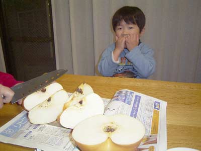 味は・・・? ・・・。 何だか、罰ゲームみたいだな。 初めて梨を食べたので、 シャクシャク感に戸惑ったよう。 美味しい梨でした。 |
