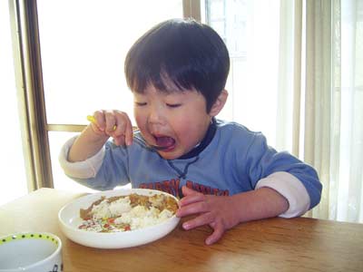 昼食は大好物のカレーライス。 って、スプーンに乗ってないぞ? |
