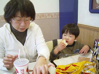 昼食はケンタ。 子は持参したお弁当。 ジャム食パン。 |