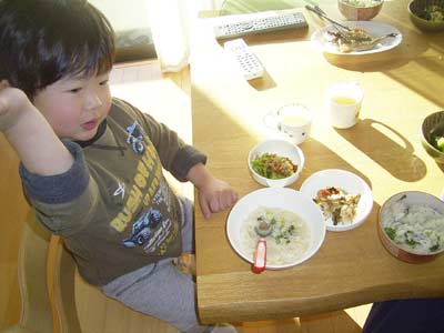 で、朝食。 お粥は好評で、バクバク完食でした。 |