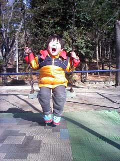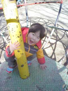 クルクル遊具でも、初めて笑顔になった。 もちろん超低速回転だが。 |