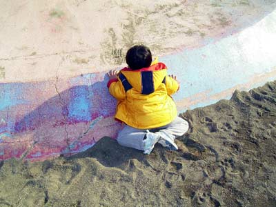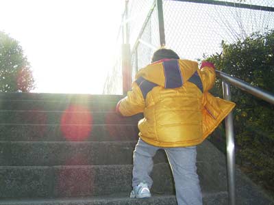 三輪車もだいぶ上手くなった。 しかし下り坂では加速がついて操作不能に。 足で力を殺すことができない。 バックもできない。 このあたり、子供同士で遊べない影響が。 |