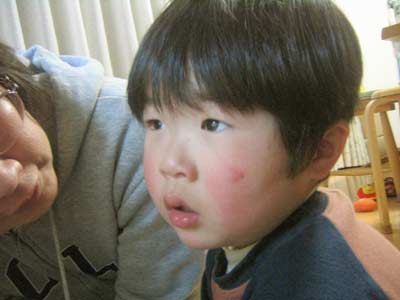 子の風邪も徐々に良くなりつつあるが、 なかなかスッキリとは治らないでいる。 思えば左頬の蚊に刺された跡は3ヶ月経った今も残り、 続いて同じく左頬の発疹もずっと引かずに赤いままである。 BCGのハンコ注射痕もまだ痒いようで、 1ヶ月以上経った今、点々が赤々と盛り上がっている。 |