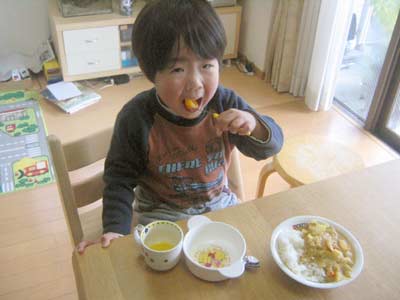 お米がこぼれちゃったの。Sちゃんビックリしてないちゃった!」