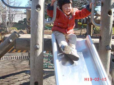 真っ先に滑り台に到達したので、ロープ網の登りを誘ったが拒否されてしまった。