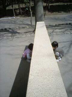 今日もよく遊んだそうだ。 公園では女の子と「パン屋さんごっこ」。 しかし活発なその子はすぐに別の所に遊びに行った。 残された子は、「誰か来てくださ〜い!誰か、買ってくださ〜い!」と、 公園の場末で世界の不況を叫んでいた。