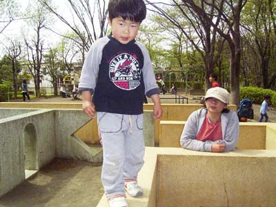自らトライはするものの、 相変わらず高所歩行は苦手。 バランス感覚ゼロ、まだ平地でも片足で立つことすらできない。 そりゃ怖かろう。 |