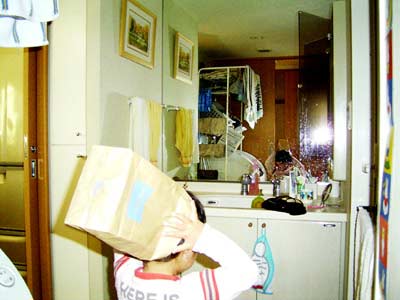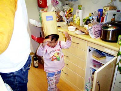夕食準備。 薬局の袋をかぶって「コックさん」 |