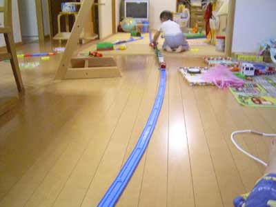 もちろんプラレール遊びも健在である。 最近の流行は長ーいレールだ。 |