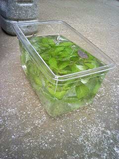 プラケースに水を張り、葉っぱを入れた。 ・・・俺の真似か? |