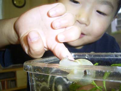 カタツムリには悪いが、 ツンツンこづいて満足そうだ。 でも寄生虫が居る可能性があるので、 触った後はよく手を洗おう。 |