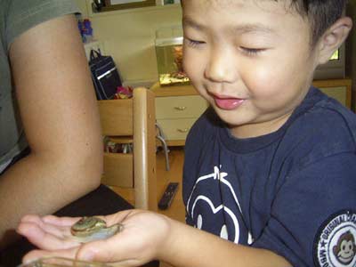 ジジババ宅で念願のカタツムリを見つけた。 大喜びだった。 |