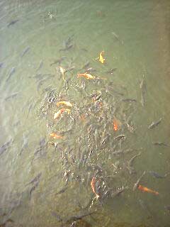 河を覗いたら、大きな亀が。 亀にエサをあげたら鯉の大群が群がって、 亀洗い状態に。 |