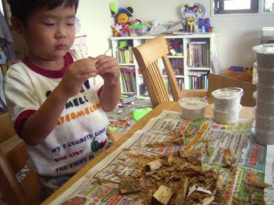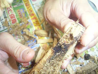 午後はクワガタの幼虫の回収を行った。 マニアでは「一番楽しい」作業と言われているが、 私には面倒なだけである。 よって助っ人投入である。 |