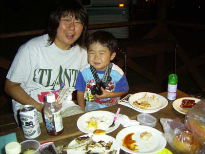 夕食は、バーベキュー。 昼に釣ったニジマスと、 Sに併せてササミなどを焼く。 やっぱり炭火は美味しい。 |
