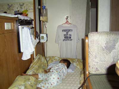 疲れてあっという間に寝に落ちた。 ベッドでは転落して万一胃ロウが破損してしまっては大変、 マットを床に敷くことにした。 当然、胃ロウポンプも持参。 今朝のように吐いたり、食欲が無かった時など胃ロウのありがたさを再認識する。 延長コードは忘れずに。 せっかく電源があっても、危うく涙を呑む所だった。 |