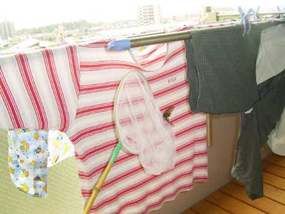 洗濯物にセミが。 網で捕まえて喜んでいたそうだ。 |