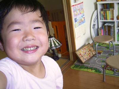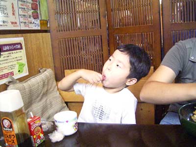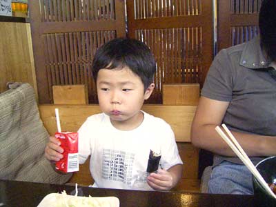 Sは朝からハイテンション、 アッという間に汗びっしょり。 水分補給! |