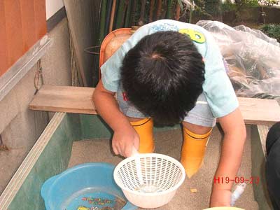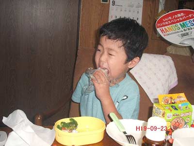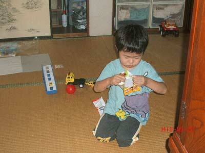 今日の私の仕事は、庭のガス管の位置確認のため土方をしました。 当然孫も一緒に土方を手伝だってくれました。 写真は撮れませんでした。 時間の内約半分は外で過ごしました。 残り半分は、ババとビデオテープを見たり、 絵の具でお絵かきをして過ごしました。非常に元気でした。 絵の具の筆とパレットは綺麗に洗ってくれました。 昼食は約90%位で少し残しました。 ウンチは無し。オシッコのみでした。