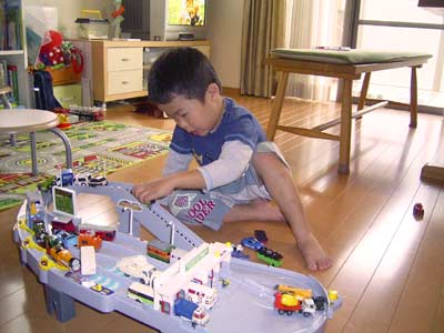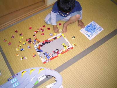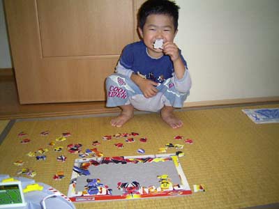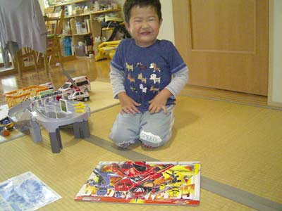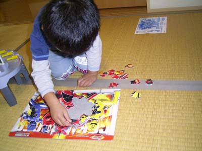 午前中は、頂いたトミカのオモチャに没頭し。 その間おママはメニュー作りをすることができた。 これは、大きい。 作りかけの69ピースのパズルに再挑戦。 どうやらパズルのコツをつかみ、 また楽しさもわかってきたようだ。 大好きなゲキレンジャーということも大きいが・・・。 な?完成すると嬉しいだろう? 今日は天気も悪く、1日家にいた。 よい休息となっただろう。