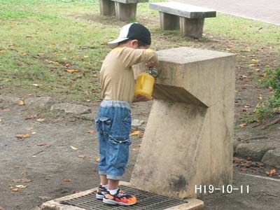 水を汲んでは砂場に持ってきて砂を固めて遊んでいました。
