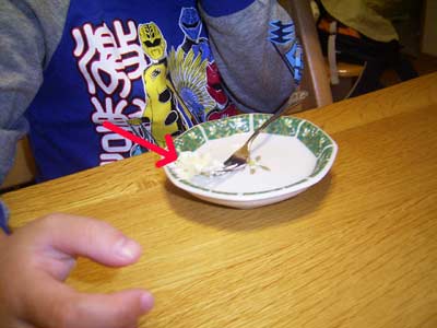 早速ケーキを頂く。 食べ終わりの写真ではなく、 Sが食べられる分を取り分けたお皿。 生クリームは油がありすぎて、 僅かしか食べさせることができない。 |