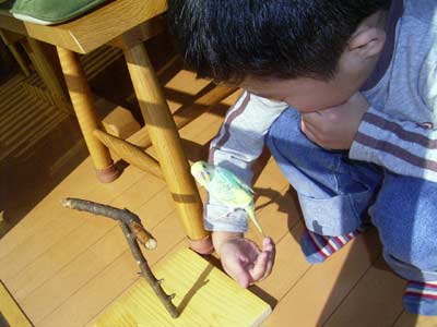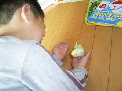 ピヨを手に乗せるのも、だいぶ上手に。 |