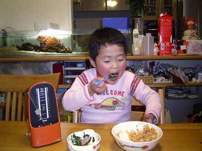 リズム感ないSのために、実家からメトロノームを持ち帰った。 試しに食事中に鳴らしてみたところ、 そのリズムに合わせて食べようと速く噛んでいた。 いいぞ、S。 最高だ、メトロノーム。