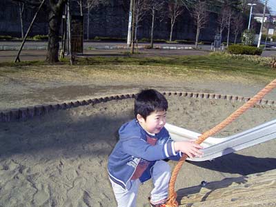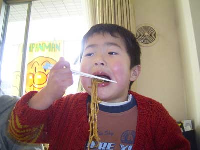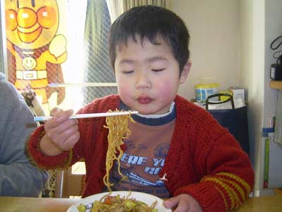 ちゃんと口に到達している。 何より箸を使おうという意志が嬉しい。 |