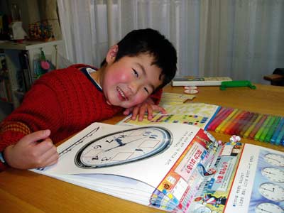 テレビの仮面ライダー電王は先週最終回だった。 Sの電王ワークブックも、今日完遂した。 ストーリーの鍵であった「時間」 時計と一緒に記念撮影。 |