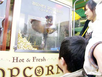 ナンダ?コレワ?! どんどん出てくるポップコーン、 まじまじと見つめていた。 |