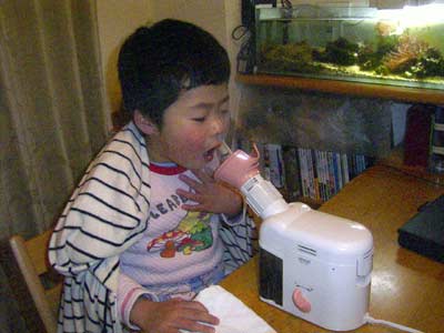 今日も家で安静に。 夜も早くに寝かせたが、体力余る4歳児は寝付けない。 おまけにどうも咳が止まらない。 ならばと(自宅で)初めて吸入をさせてみた。