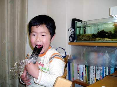 ちなみに節分マメは4つ4回口に含み、 全て吐き出してしまった。 仕方無しに大好きなチーズに埋め込んだら、 やっとバリバリと噛んでくれた。 でも、ちょっと口元にモザイクが必要だった。 |