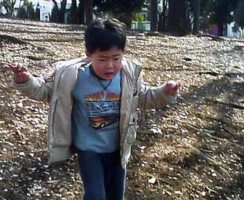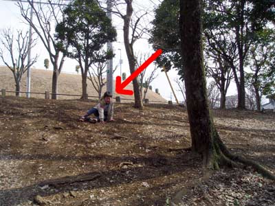 へたり込んで泣き叫ぶS。 写真で見るより坂は全然なだらかだ。 |