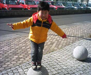 一昨日やらせた玉オブジェ乗り。 今日は幸先よく1人で乗れた。 |