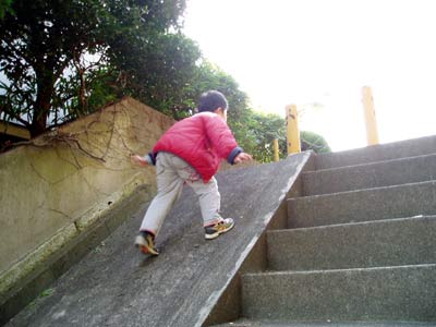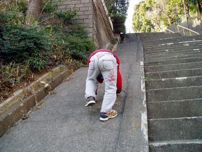 ジジババ宅近くの階段。 先月この坂を試した時は、敵前逃亡。 しかし今日はいきなり1人で上がっていった。 |