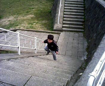 階段ダッシュも、写真だと格好良い。 現物は2歳児ロボット状態。 何とかしてぇ〜・・・。 |