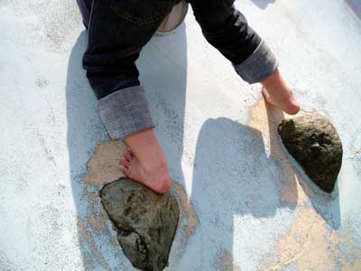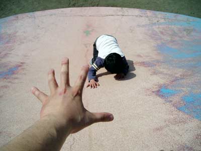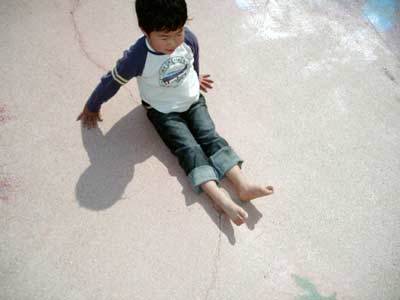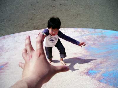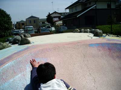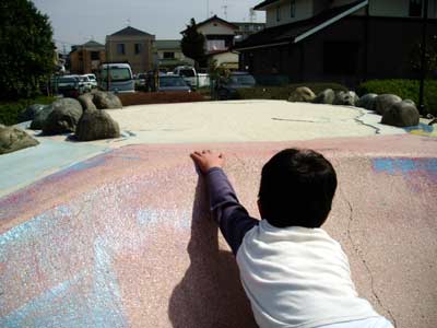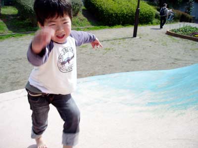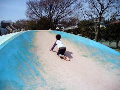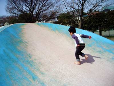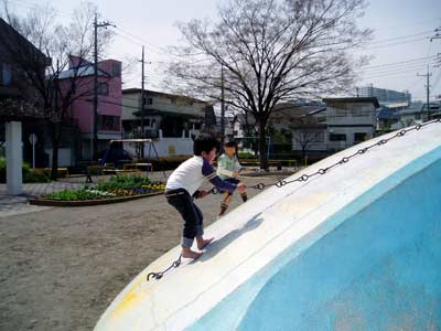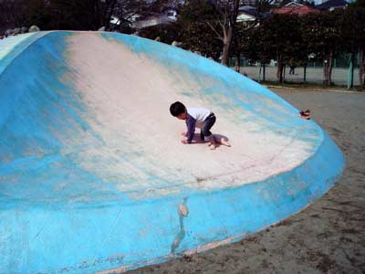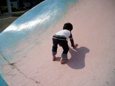 もう一つの公園では、ドーム滑り台を駆け上がる。 裸足で足裏の感覚と力を養う。 |