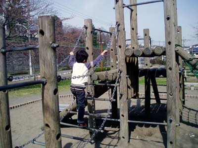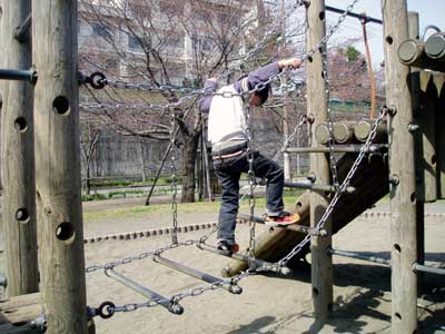 ふと、Sが後ろ向きに吊り橋を降り始めた。 これまで教えたことしかやらなかった。 いや教えたことすら出来なかったSであるが、 初めて自分で考えて、遊びを工夫することができた。 |