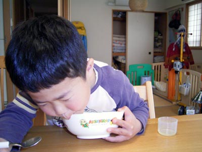 カメラを向けると、下向いてしまった。 何もそんな格好で食べることないだろう。 |